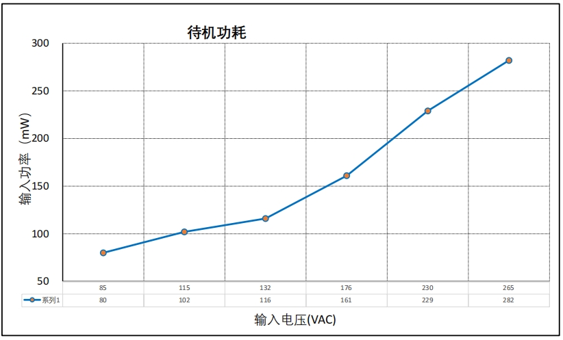 在 230VAC 輸入下,包含 1kΩ 假負(fù)載的待機(jī)功耗為 229mW,滿足大多數(shù)應(yīng)用場景的低功耗要求。