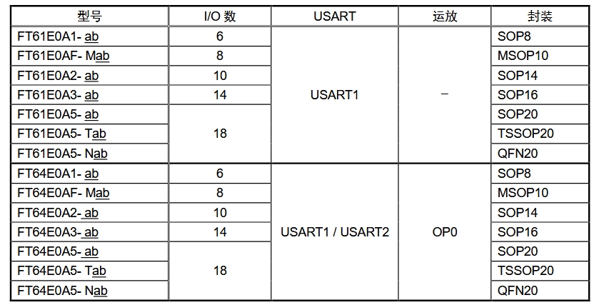注:FT61E0A為同系列簡化版(無USART2和運放),型號僅差一位“1”。