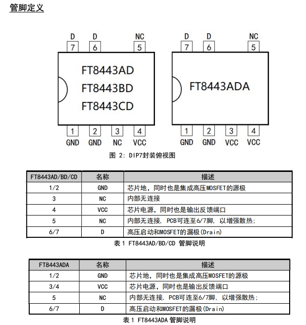 ? FT8443ADA:入門款,300 mA 穩態輸出,650 V 內置 MOS,DIP-7 散熱焊盤小,適合小家電、智能開關等成本敏感場景。