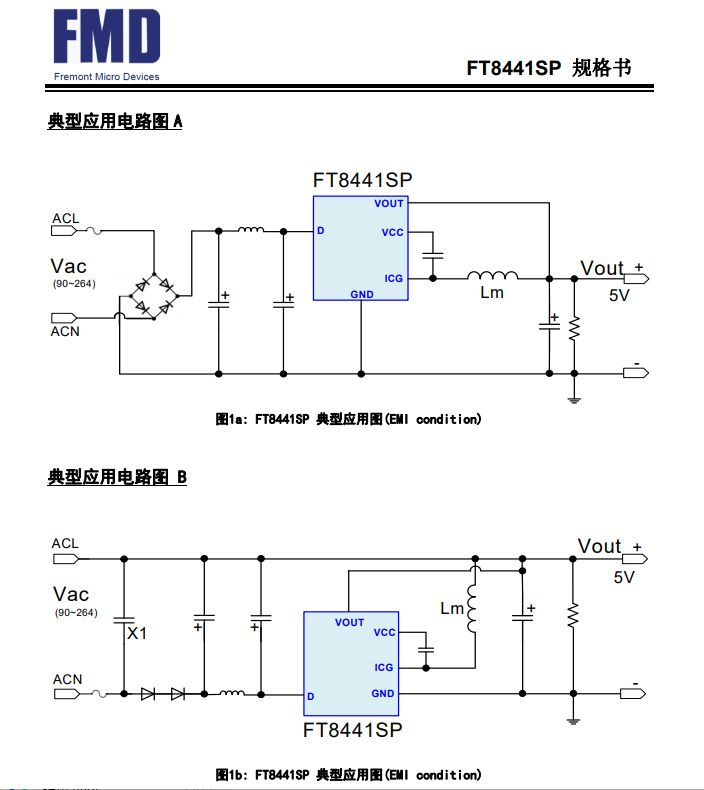 FT8441SP采用極高壓技術(shù),通過內(nèi)置高壓啟動電路、高壓功率MOSFET開關(guān)以及電流采樣電阻,減少了外圍元器件,大大的簡化了系統(tǒng)應(yīng)用。內(nèi)置的抖頻和軟驅(qū)動技術(shù)有效的提高了EMI性能。
