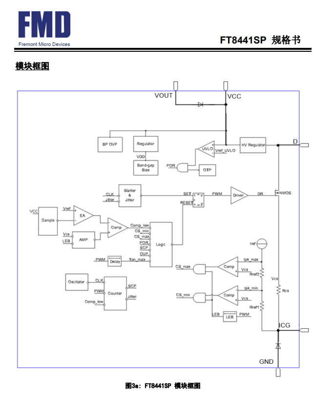 FT8441SP還集成了其他功能:VCC欠壓保護(UVLO)、VCC欠壓保護(UVLO)、VCC過壓保護(OVP)、過溫保護(OTP)、逐周期過流保護(OCP)、輸出短路保護(SCP),從而保證了系統(tǒng)的可靠性。