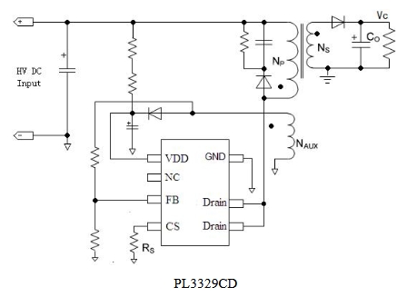 復合模式的應用使得芯片能夠實現低靜態功耗、低音頻噪音、高效率。而且高集成的功率 MOSFET 能夠降低外部 PCB的面積以及系統的成本。PL3329C 同時具有多種保護功能:逐周期峰值電流檢測、欠壓保護、過壓保護等。