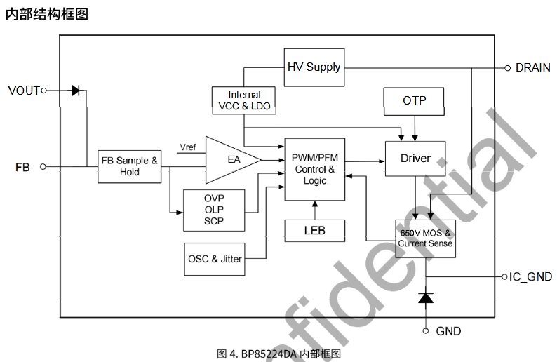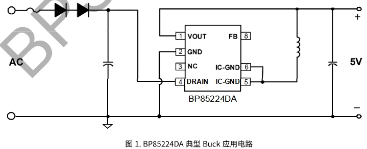 BP85224DA 是一款高性能、高集成度、低待機功耗的開關電源驅動芯片,適用于全電壓 85~265VAC 輸入的 Buck、Buck-Boost 變換器拓撲應用。 BP85224DA 內部集成了 650V 高壓 MOSFET、高壓啟動和自供電電路、電流采樣電路、電壓反饋電路以及續(xù)流二極管,采用先進的控制技術,無需外部 VCC 電容和環(huán)路補償即可實現(xiàn)優(yōu)異的恒壓輸出特性,極大地減少了外圍器件數(shù)量,節(jié)省了系統(tǒng)成本和體積,同時提高了可靠性。