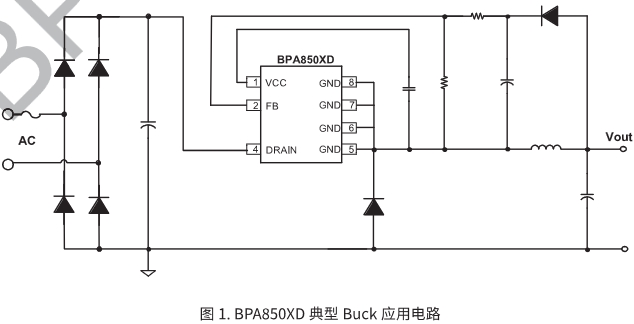 BPA8505D 系列芯片是一款高性能、高集成度、低待機功耗的開關電源驅動芯片,適用于全電壓 85~265VAC 輸入的Buck、Buck-Boost、 Flyback 等變換器拓撲應用。 BPA8505D 系列芯片內部集成了 650V 高壓 MOSFET、高壓啟動和自供電電路、電流采樣電路,以及采用先進的控制技術,無需外部環路補償即可實現優異的恒壓輸出特性,極大地減少了外圍器件數量,節省了系統成本和體積,同時提高了可靠性。