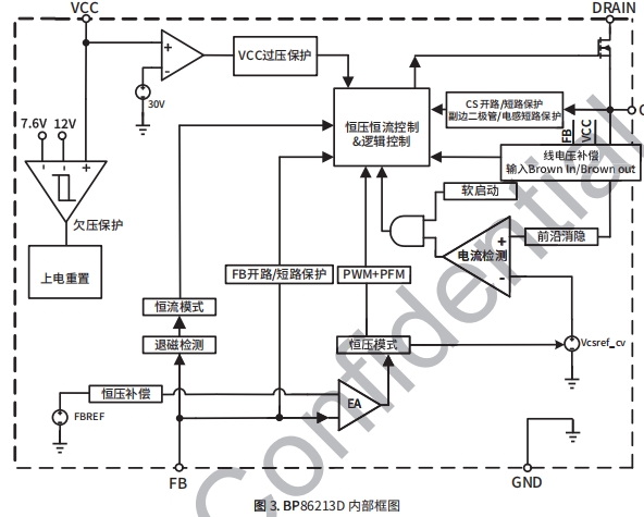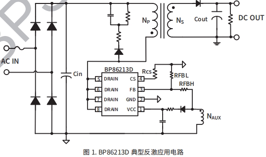 BP86213D 芯片集成650VMOSFET、高壓啟動和供電電 保護(hù)功能 路。采用PWM/PFM多模式控制技術(shù),從輔助繞組給VCO 輸入欠壓保護(hù)(Brown-in/out) 供電,能有效降低系統(tǒng)待機(jī)功耗,提高效率和動態(tài)性能, 并減小系統(tǒng)工作在輕載時的噪聲。