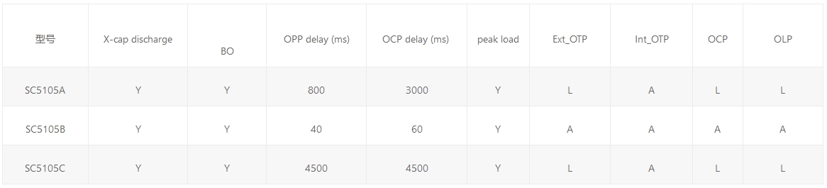 SC5105是一款集成高壓啟動與X-CAP放電功能的高性能電流模式PWM控制器,具有BO、OPP和OCP保護和鎖死功能,提高了系統的安全性。為適應峰值負載,提供了峰值功率輸出功能;高低壓補償技術減小了高低壓OCP的差異;獨特的頻率抖動技術和GATE軟驅動技術,改善了系統EMI性能。