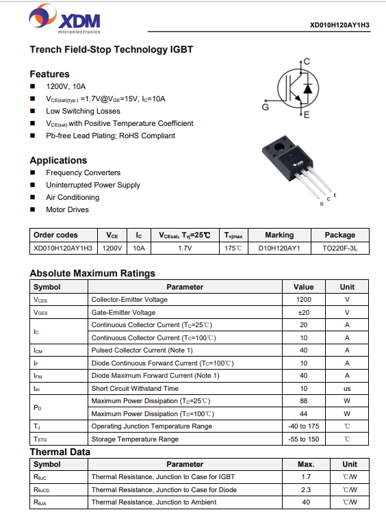 XD010H120AY1H3 國(guó)產(chǎn)IBGT 芯達(dá)茂 10A 1200V TO-220F-3L